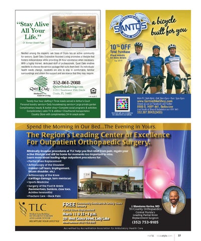 The Region’s Leading Center of Excellence For Outpatient Orthopaedic Surgery. Minimally-invasive procedures at TLC help you find relief from pain, regain your active lifestyle and still be home for moments too important to miss. Learn more about leading-edge outpatient procedures for: • Partial Knee Replacement • Arthroscopy of the Shoulder (rotator cuff tears, impingement, frozen shoulder, etc.) • Arthroscopy of the Knee (cartilage damage, torn meniscus) • Sports Medicine • Surgery of the Foot & Ankle (hammertoes, bunions, claw toes, Achilles tendonitis) • Fracture Care • Back Pain Seminars & Facility Tours FREE Community January Partial Knee Replacement