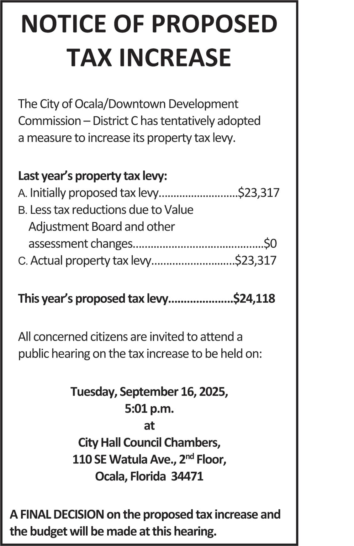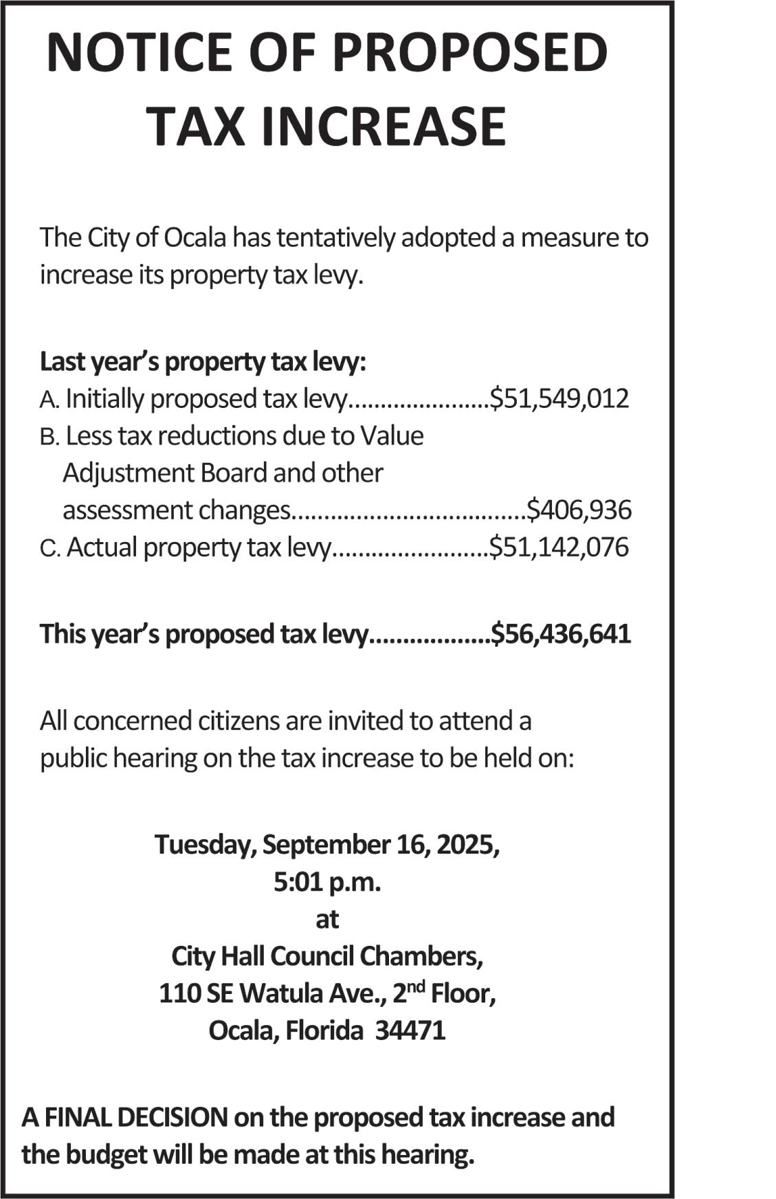 Notice is hereby given that the School Board of Marion County, Florida, will meet on September 23, 2025, at 5:30 p.m., at the School Board Administration Office, 1614 E. Ft. King Street, Ocala, Florida, 34471. An agenda will be published seven days prior to the meeting. The agenda may be obtained at the Administration Office between the hours of 8:00 a.m. and 5:00 p.m. The agenda is also available from a link on the District’s website: www. marion.k12.fl.us.