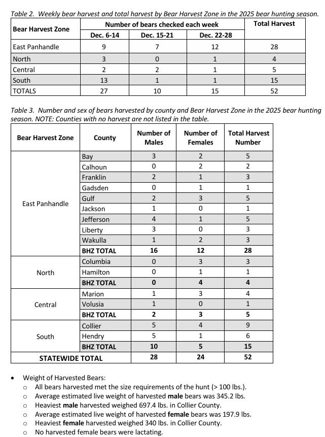 “All bears harvested met the size requirements of the hunt,” a release from the FWC stated. “No warnings or citations were issued for violations of bear hunting rules.”
