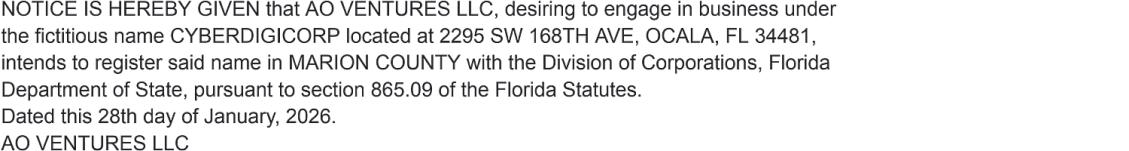 Ocala Gazette (USPS# 25590) (ISSN 2771-1595) is published weekly by Magnolia Media Company, LLC, PO BOX 188, OCALA, FL 34478. Periodicals postage paid at Ocala, FL.
