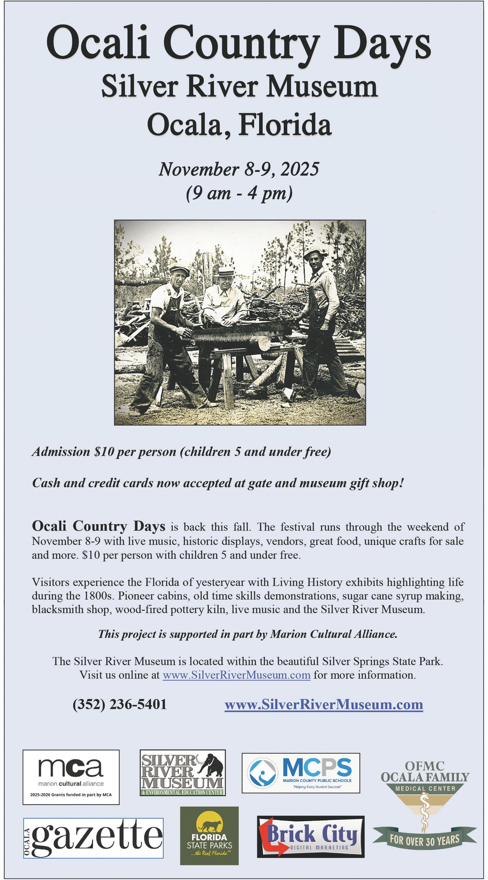 Visitors experience Florida of yesteryear with living history exhibits highlighting life during the 1800s. Pioneer cabins, old-time skills demonstrations, sugar cane syrup making, a blacksmith shop, woodfired pottery kiln, live music vendors, food, crafts and more. This project is supported in part by the Marion Cultural Alliance. Admission $10 per person (children 5 and under free). The museum is inside Silver Springs State Park. To learn more, call (352) 236-5401 and go to silverrivermuseum.com