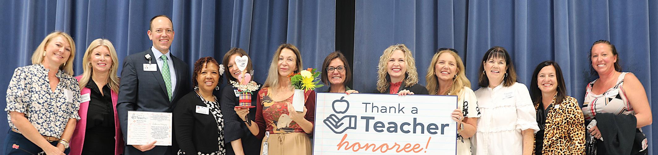 From left: Angela Ponder, principal, Hammett Bowen Jr. Elementary School; Meghan Magamoll, executive director, PEFMC; Alan Keesee, CEO, HCA Florida Ocala Hospital; Stephanie Hill-Palmer, PEFMC board; Erin Buss, PEFMC board; Rebecca Koloszy, Thank a Teacher recipient; Danielle Brewer, MCPS interim superintendent; Allison Campbell, school board member; Lori Conrad, school board chair; Julie Shealy PEFMC board; Melissa Conner; and Renae Robinson, PEFMC board. [Submitted photo]