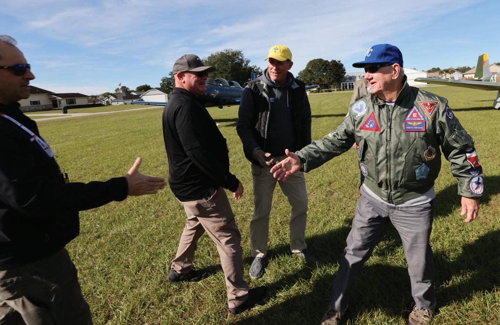 they prepare to fly their Honor Flight over the Veterans Day ceremony at the Ocala-Marion County Veterans Memorial Park in Ocala on Nov. 11, 2025. Eight pilots of the eight Nanchang Chinese Air Force aircraft met at Leeward Air Ranch to debrief and get ready before the flyover. [Bruce Ackerman/Ocala Gazette]