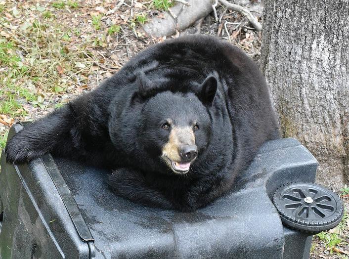 Florida black bear and garbage can. [Photo courtesy FWC]