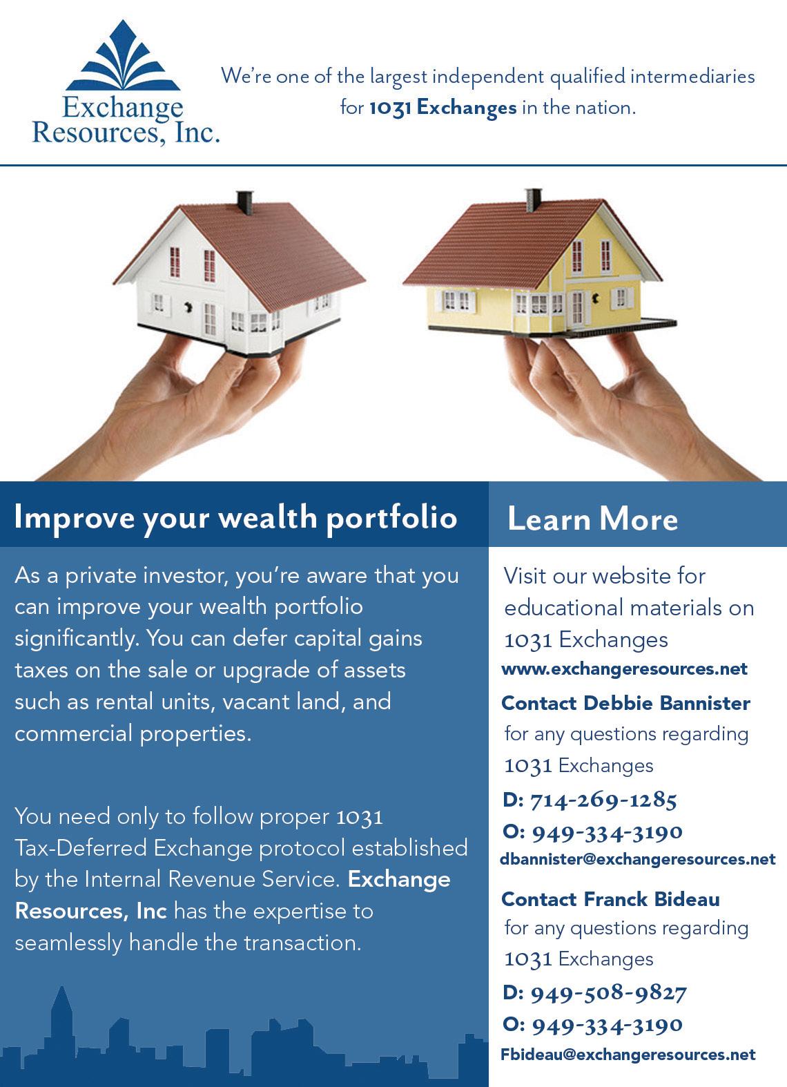 Leader1031 Qualified Intermediary Services Kayla Frerking www.Leader1031.com Vice President, Western USA 760-622-7716 | kayla.frerking@leaderbank.com Lender NMLS# 449250 4 1031 Exchanges Exchange Resources, Inc. Debbie Bannister 714-269-1285 dbannister@exchangeresources.net Franck Bideau 949-508-9827 Fbideau@exchangeresources.net Leader Bank, N.A. Leader 1031 Kayla Frerking 760-622-7716 kayla.frerking@leaderbank.com Appraisal & Property Tax Appeals Alewyn Appraisal Group Jeff Alewyn 714-742-1843 appraiserjeff@ca.rr.com CMP Appraisal Mark Buhler 949-283-0975 mark@cmpappraisal.com Shorecliff Appraisal Services Jim Schuerger 949-309-1346 shorecliffappraisal@gmail.com
