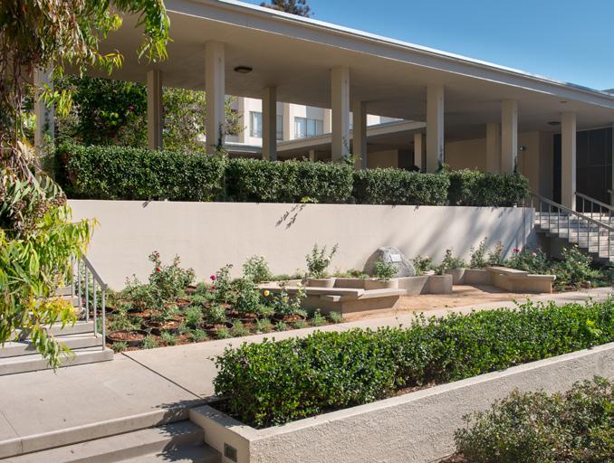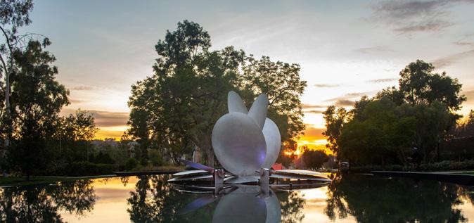 The Lucille Y. Gilman Memorial Fountain is located at the Alumni Drive entrance to campus. The late George Baker ’58, who taught sculpture at Oxy from 1964 to 1997, designed the kinetic fountain Water Forms II, which he built with his students in 1979. Trekkers might recognize the fountain from the film Star Trek III: The Search for Spock, filmed at Occidental in 1983.