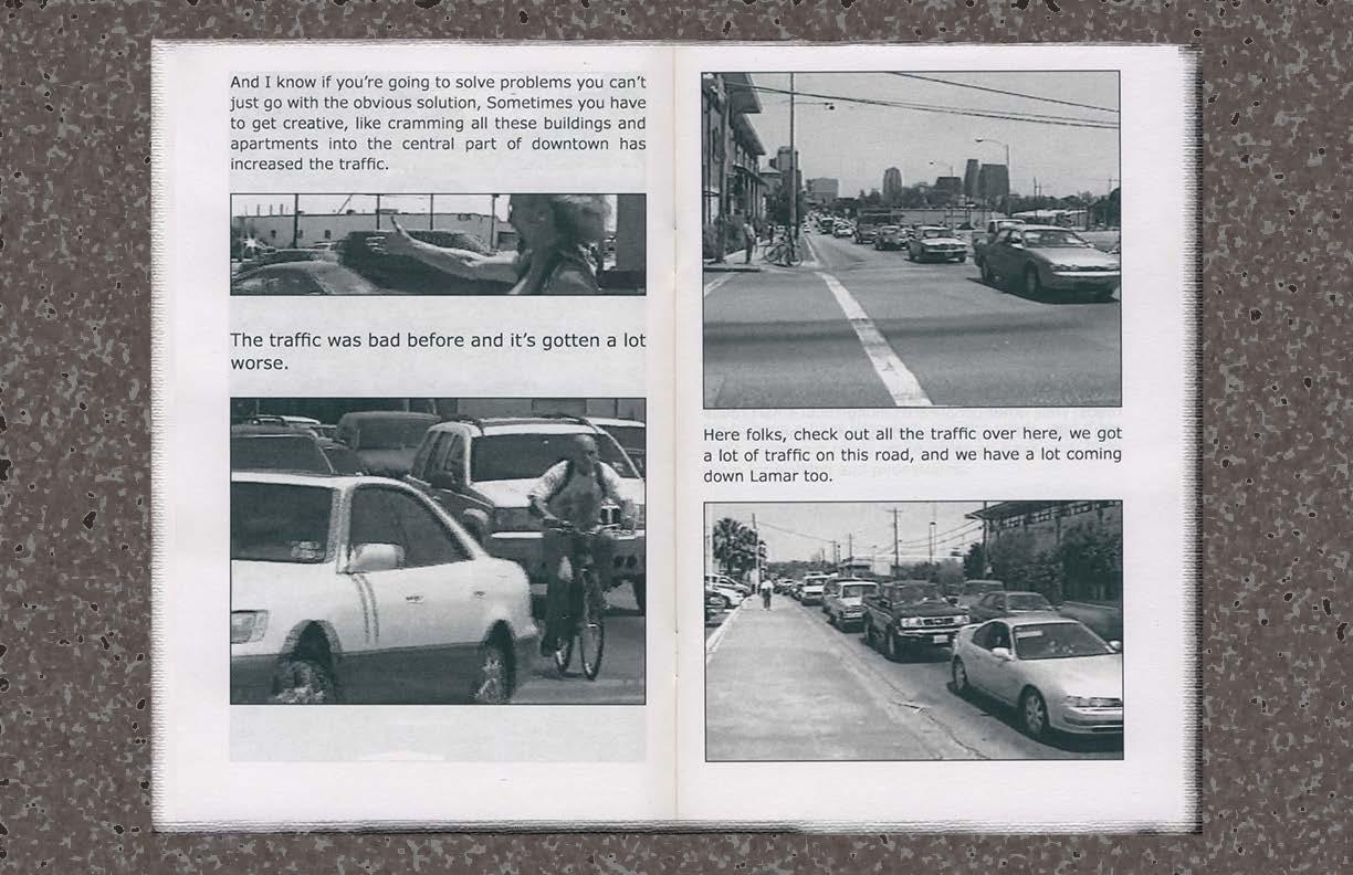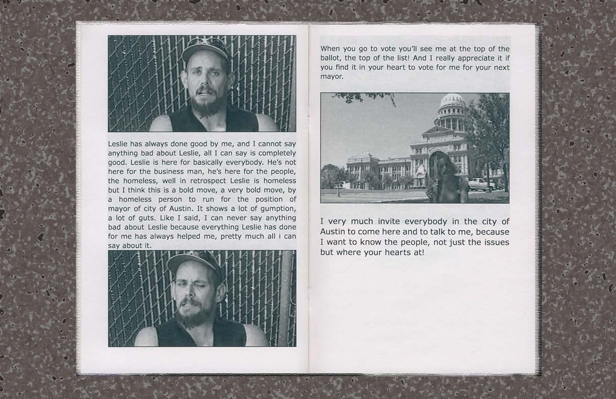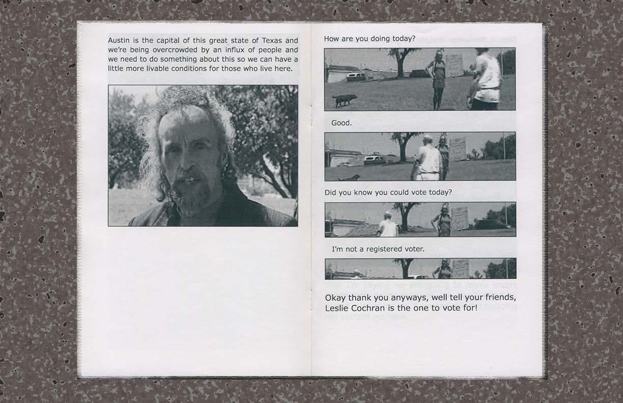 “Top of the List!” is a film-to-book adaptation of a campaign video I found in the ATXN video archives for Leslie Cohcrans loud and DIY run for mayor of the City of Austin, Texas, in May 2000. Leslie Cochran was a homeless cross-dresser, self-proclaimed statesman, city wide heartthrob, and an anti-monument to my past paving the way for radical policy change and queer folks alike. Leslie lost the 2000 mayoral election to Texas state senator Kirk Watson, winning only 7.7% of the city’s vote. In this zine I hybridize early 2000s Sunday comic spreads and television closed captions using subtleties in type treatment and image variations to create compositions highlighting Leslies’ irreverent humor and earnest desire for human-centered change. I vividly remember the conversations Leslie ignited within the larger socio-political landscape of Austin, these were uncomfortable conversations people didn’t want to have surrounding gender and economic heirarchies; everyday citizens didn’t/couldn’t see cross-dressing is a means of gender expression rather than a fetishized sexual act, nor did they see it as entertainment expression like drag. Equally, they didn’t/couldn’t see past Lelie as a person experiencing homelessness, blinding them to the drastically human-centered platform Lelie was running on. In many ways we’re active observants of the echoes of this toxic mindset through legislation that is being passed, and contested, regarding public camping bans (Texas House Bill 1925, LAMC 41.18).