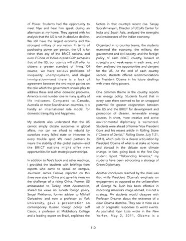 factors in that country’s recent rise. Sanjay Subrahmanyam, Director of UCLA’s Center for India and South Asia, analyzed the strengths and weaknesses of the Indian economy. Organized in to country teams, the students examined the economy, the military, the government and civil society, and the foreign policy of each BRICT country, looked at strengths and weaknesses in each area, and then analyzed the opportunities and dangers for the US. At the end of each country section, students offered recommendations for President Obama in his future dealings with these rising powers. One common theme in the country reports was energy policy. Students found that in every case there seemed to be an untapped potential for greater cooperation between the US and the BRICT for development and promotion of cleaner, renewable energy sources. In short, more creative and active environmental diplomacy is warranted. Students were ahead of former Vice President Gore and his recent article in Rolling Stone (“Climate of Denial,” Rolling Stone, July 7-21, 2011), which calls for a clearer articulation by President Obama of what is at stake at home and abroad in the debate over climate change. In fact, going back to the first Oxy student report “Rebranding America,” my students have been advocating a strategy of Green Diplomacy.