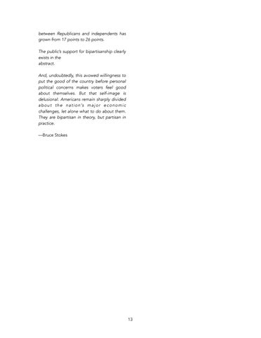 between Republicans and independents has grown from 17 points to 26 points. The public’s support for bipartisanship clearly exists in the abstract. And, undoubtedly, this avowed willingness to put the good of the country before personal political concerns makes voters feel good about themselves. But that self-image is delusional. Americans remain sharply divided a b o u t t h e n a t i o n ’s m a j o r e c o n o m i c challenges, let alone what to do about them. They are bipartisan in theory, but partisan in practice. —Bruce Stokes