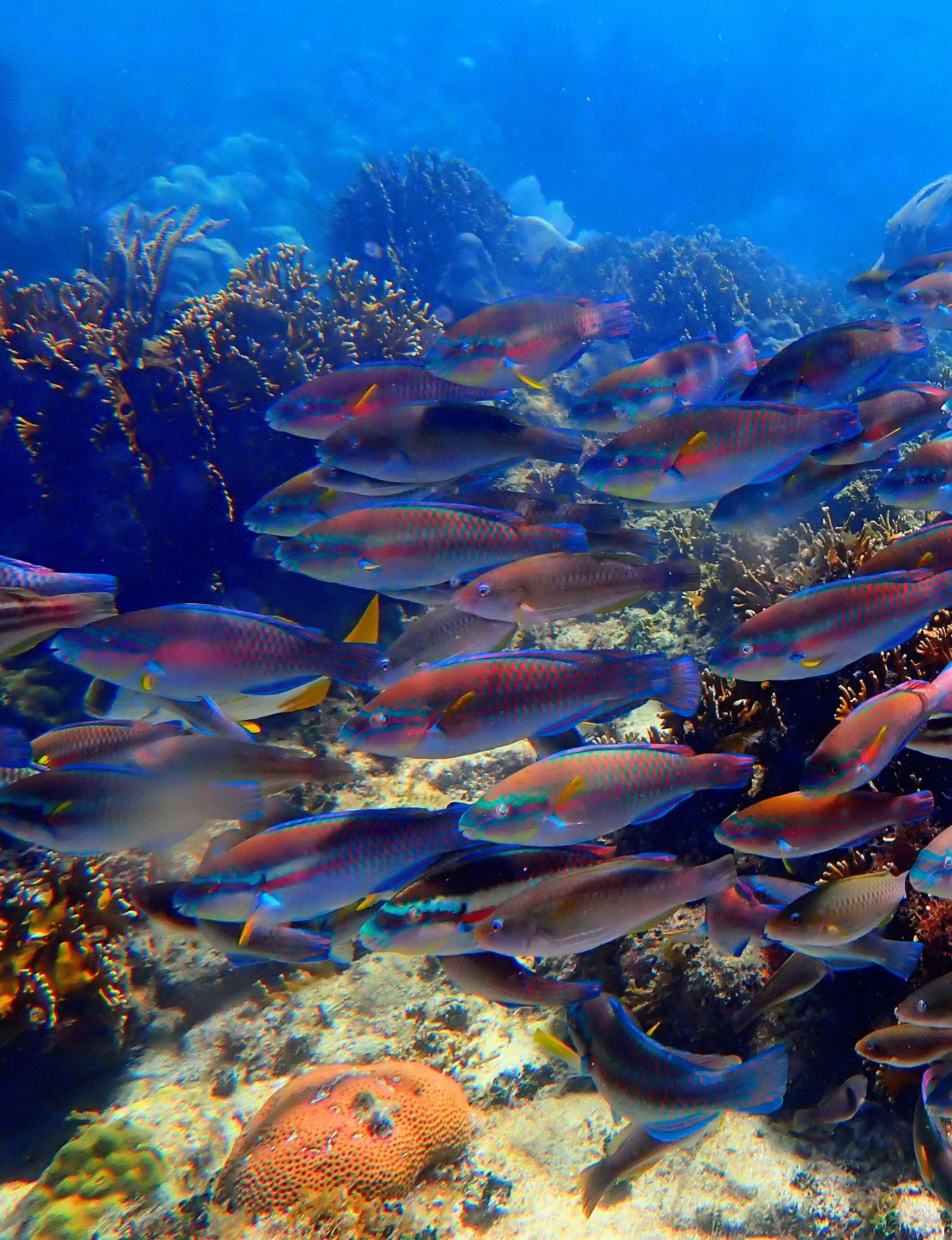 Striped parrotfish forage along a shallow patch of reef off the coast of Placencia, Belize, which Oceana is campaigning to protect from the threat of offshore oil exploration and exploitation.