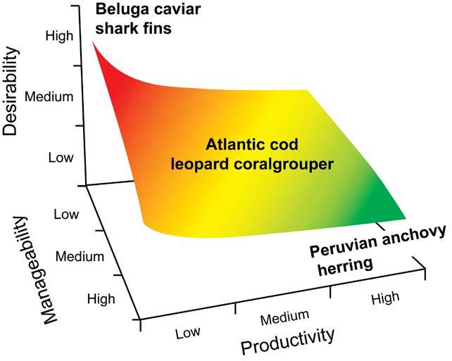 Beluga sturgeon and sharks are desirable, hard to manage and don’t reproduce often. Herring and Peruvian anchovy are productive and manageable, but aren’t particularly desirable.