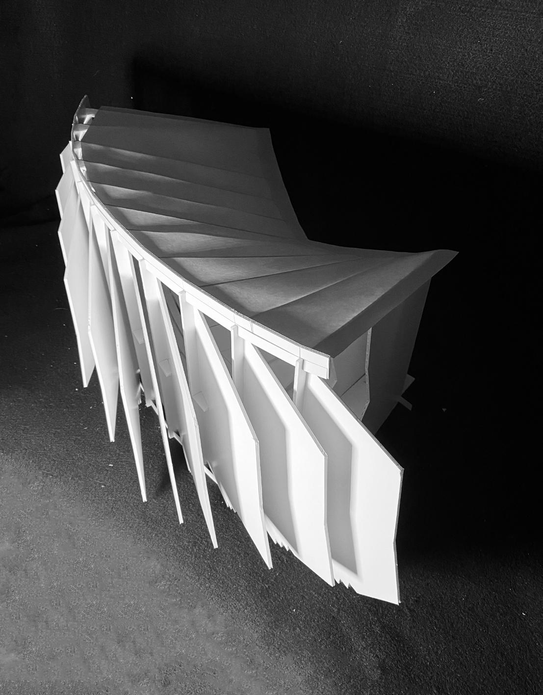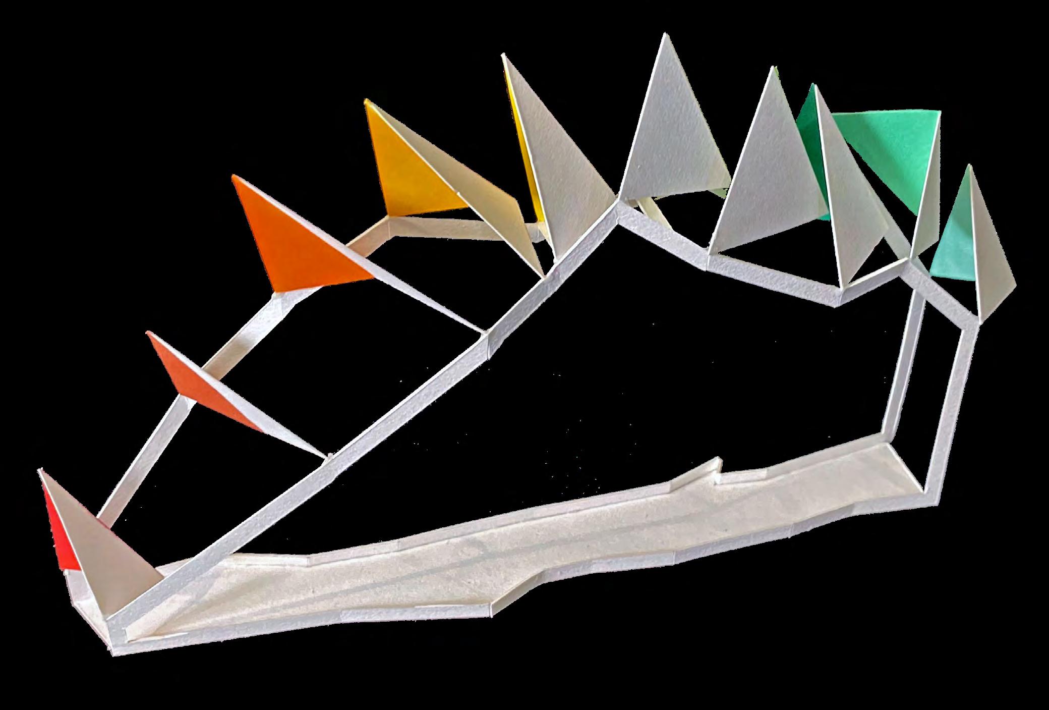I distilled my shape from a section from JOHO Architects’ Nine Bridges Pergola. I love how the shape is reminiscent of a house. The pergola is a space made to be experienced as a moment of pause and a journey through. I tried to replicate this experience by having both a pathway and a n enclosed area in my light-box.