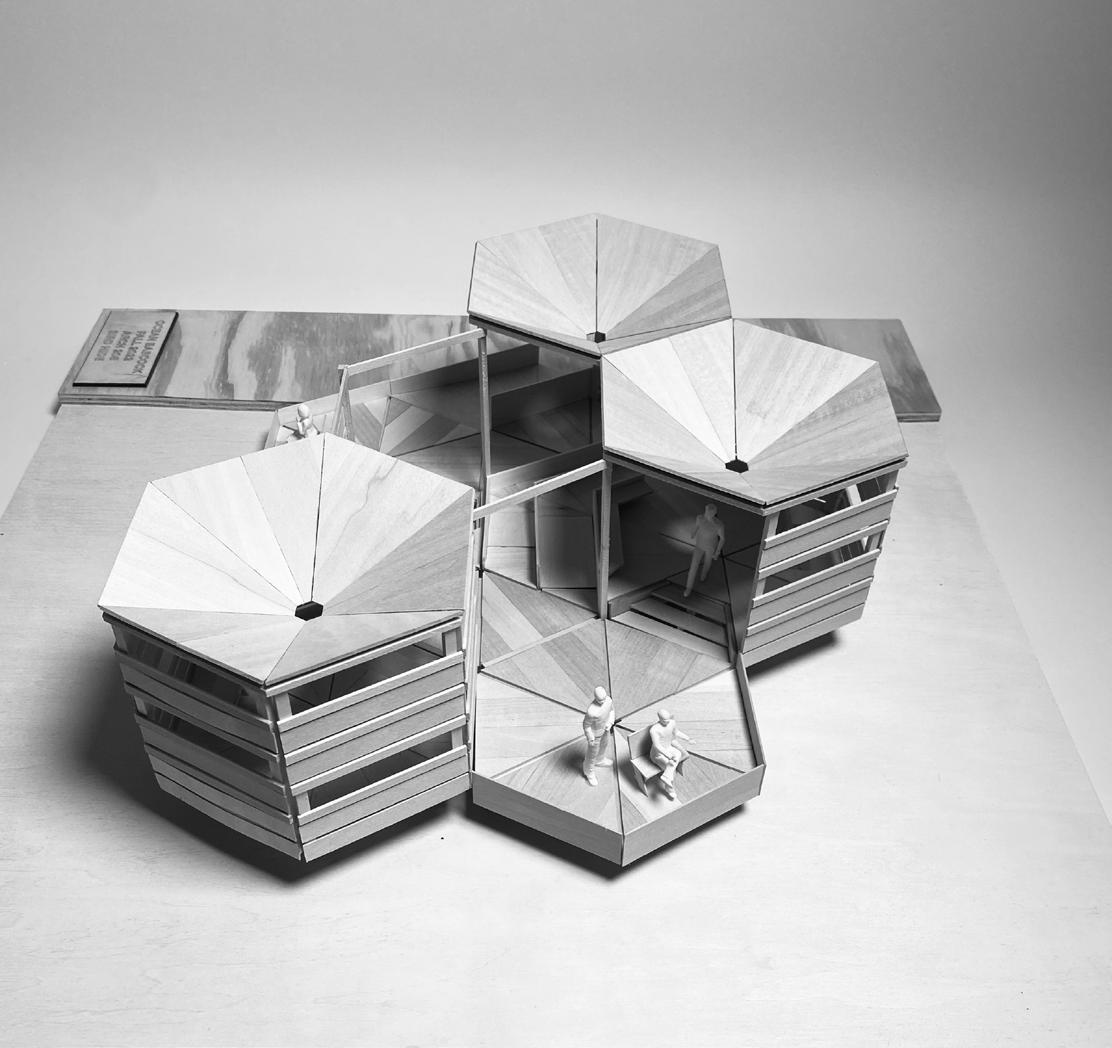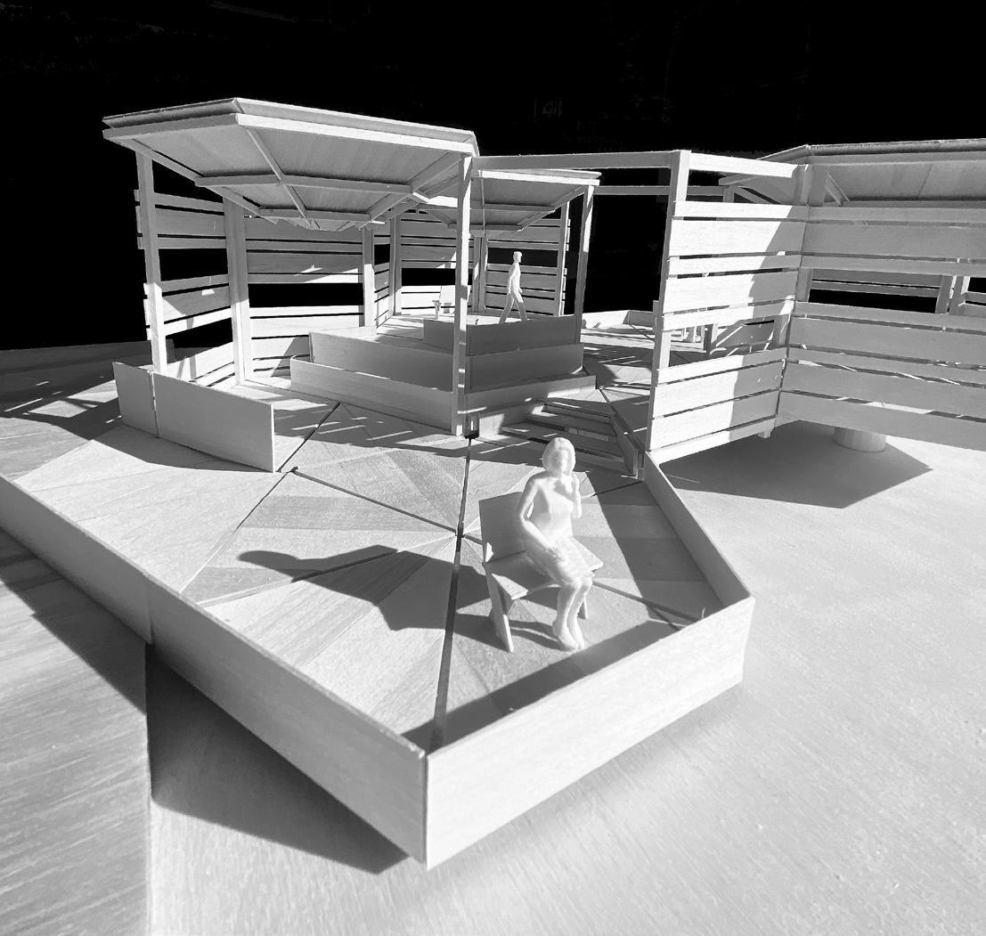 I constructed the model in pods. The hexagon shape of each pod allows them to fit together nicely. I used a 3D printer to create the base connection and space the supports evenly. The inverted roof nods to the surrounding lily pads and creates a waterfall experience when it rains. The gaps in the floor allow for drainage.