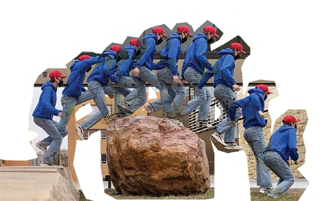 I began this project by wandering around trying to think of something interesting to do. I found a large rock. I had found my action. I took a video of myself jumping up and over the rock. I then took stills from the video and translated them into a puppet drawing to understand how the different pieces of our bodies moved.