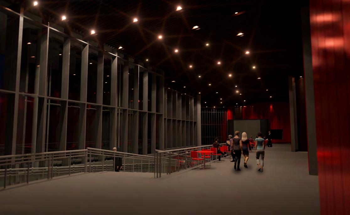 A tension grid is installed in the black box theater which allows for flexible lighting solutions. The seating sits on movable platforms furthering the flexibility of the space.