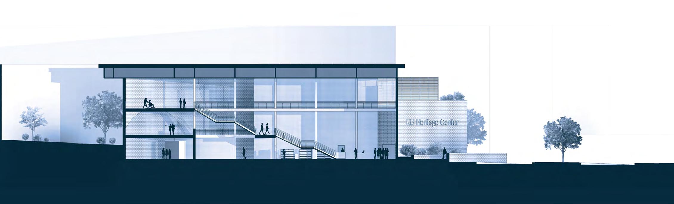 Naismith Dr as an entrance to campus provides the perfect location for a KU Heritage Center. Located across the street from the much beloved Allen Fieldhouse. The new Heritage Center draws you into campus by providing history and direction to newcomers. As you enter the building semicircle openings in the screened facade allow you to connect the past with the present as you look to the future.