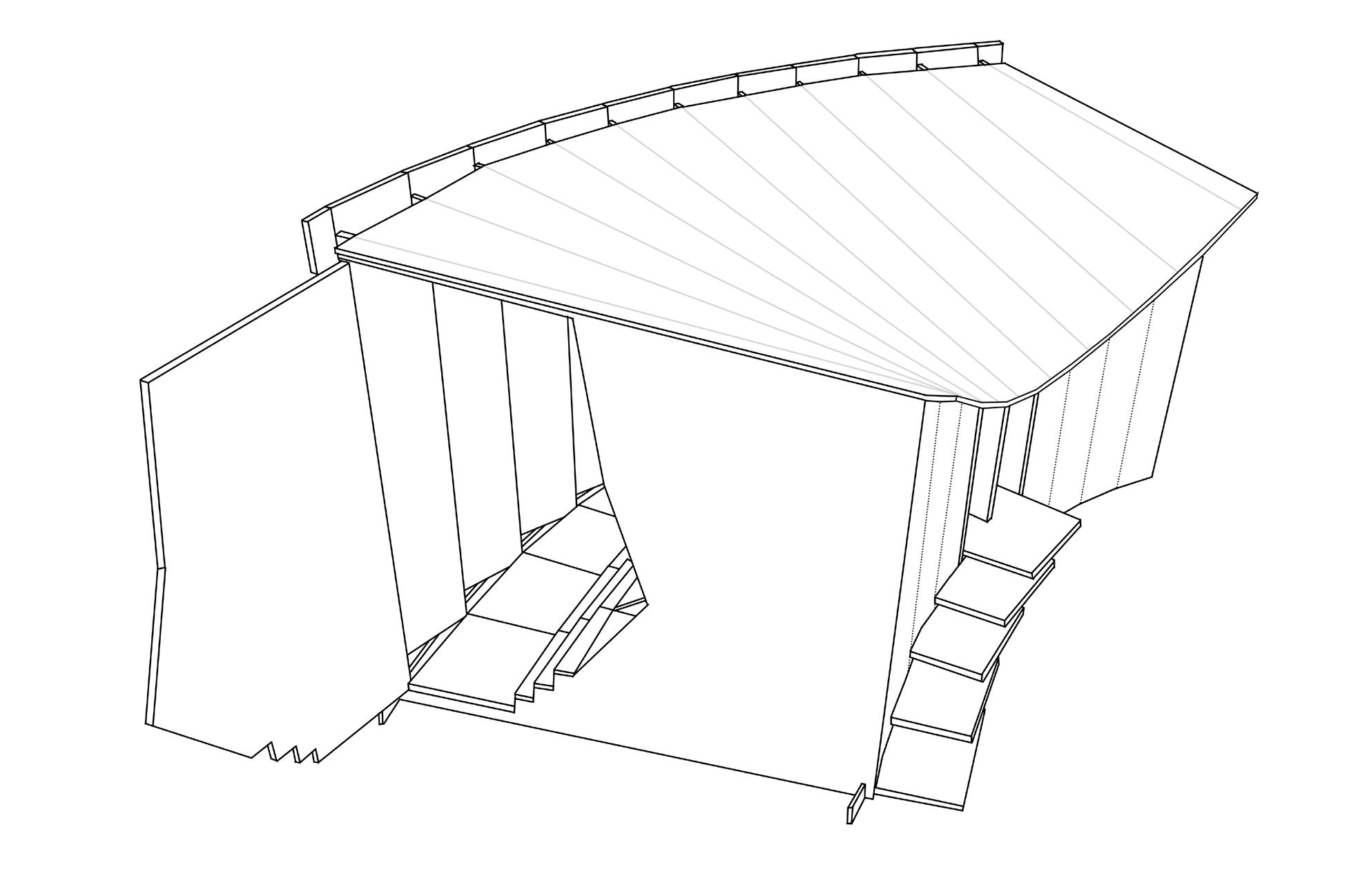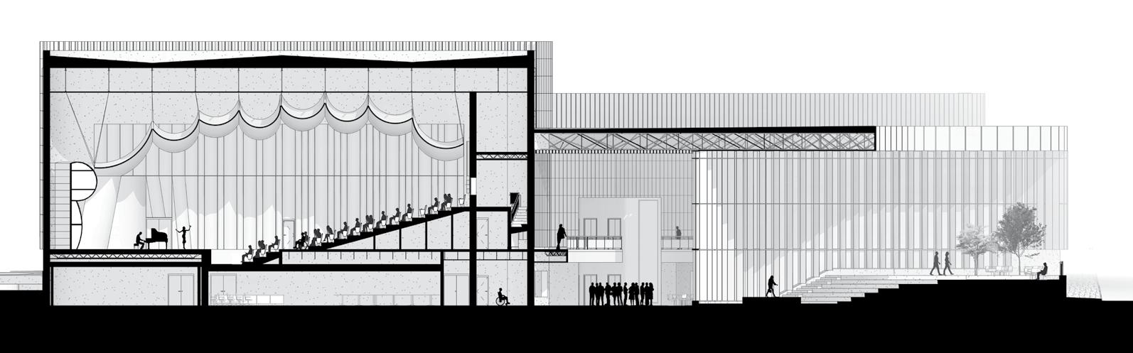 There are 3 successive spaces. First is the site itself. Its unique shape and bordering structures hold the space which can be entered through the different street intersections. Second, it the entrance into the lobby. You slip between walls to another holding space. Last, is the entry into the performance spaces marked by an ajar wall.