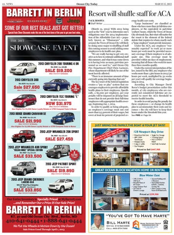 erage health care costs. “Large businesses” are classified as those who have more than 50 full-time employees, or the equivalent in part-time workers’ hours, which the Town of Ocean City obviously has. But what will matter for the resort is the element of the federal statute that requires to whom exactly such a “large employer” must provide insurance. Under the ACA, any employee “reasonably expected” to work 30 or more hours per week must be provided necessary coverage if their employer is of adequate size. This coverage must be provided within 90 days of employment, meaning that all those who work for more than three months qualify. Under the current interpretation of the law, issued by the IRS, any employee who works more than 1,560 hours in 2013 (30 hours per week, multiplied by 52 weeks per year) will qualify for coverage beginning in 2014. According to City Manager David Recor’s budget presentation earlier this month, 47 city employees who are currently not considered full-time are expected to meet the ACA threshold to receive health benefits. In order to avoid paying the penalty for these employees – or change its health plan to accommodate their costs and incomes – the city will have to keep their hours under the threshold this year.