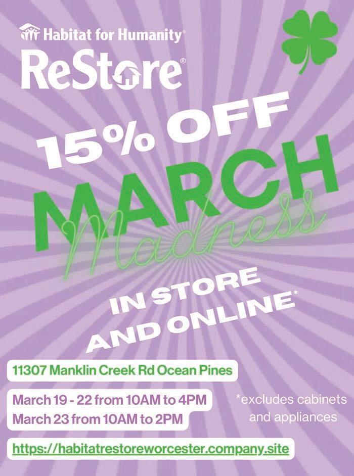 St. Peter’s Lutheran Church, 10301 Coastal Highway, Ocean City, April 13. Requesting a $20 donation per table. Deadline to reserve a spot is March 8. Linda, 443-604-8068, p.grahe@comcast.net
