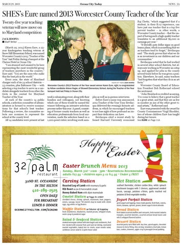 SHES’s Eure named 2013 Worcester County Teacher of the Year Twenty-five year teaching veteran will now move on to Maryland competition ZACK HOOPES ■ Staff Writer (March 29, 2013) Karen Eure, a 25year kindergarten teaching veteran at Snow Hill Elementary School, was named Worcester County’s 2013 “Teacher of the Year” last Friday during a banquet at the Clarion Hotel in Ocean City. “I am stunned and amazed to be here representing the most wonderful group of teachers anywhere in the country,” Eure said. “You are the ones who make this the best job in the world.” Every year, the state of Maryland charges each of its 24 school districts — 23 counties, plus Baltimore City — with selecting a top teacher to serve as a candidate alongside teachers from other districts in the contest for Maryland Teacher of the Year. At each of the county’s 14 public schools, a selection committee of administrators is formed to receive nominations for that school’s best teacher. Following a review, the committee selects one nominee to represent the school at the county level. All 14 candidates were present at last