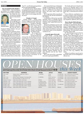 OBITUARIES Amy Jewell Alexander Rothert OCEAN PINES — Amy Jewell Alexander Rothert, 92, a longtime resident of Baltimore and Ocean Pines, died Monday, March 18, 2013, at Long View Nursing Home in Manchester, Md. Born Aug. 12, 1920 in Green Spring, W.Va., she was the daughter of the late John Clark Amy Jewell Alexander and Nell Alexander Rothert Robinson Alexander. She was the wife of Frederick William Rothert, who preceded her in death in 2012. Mrs. Rothert was a graduate of Romney High School, who completed her nursing training at Memorial Hospital in Cumberland, Md. She was an Army veteran of World War II, having served in France, England and Germany attached to the 30th General Hospital. She worked at Union Memorial Hospital in Baltimore and retired as administrator of Bel Air Convalescent Center. Mrs. Rothert was preceded in death by two brothers, Edward “Buzz” Alexander of Florida and Everett Alexander of Wilmington, Del. She is survived by two daughters, Judith Eckenrode of Manchester, Md., and Donna Rothert of Reston, Va.; three grandsons, John Eckenrode of Magnolia, Del., Adam Farver of Ocean Pines, and Andrew Farver of New York