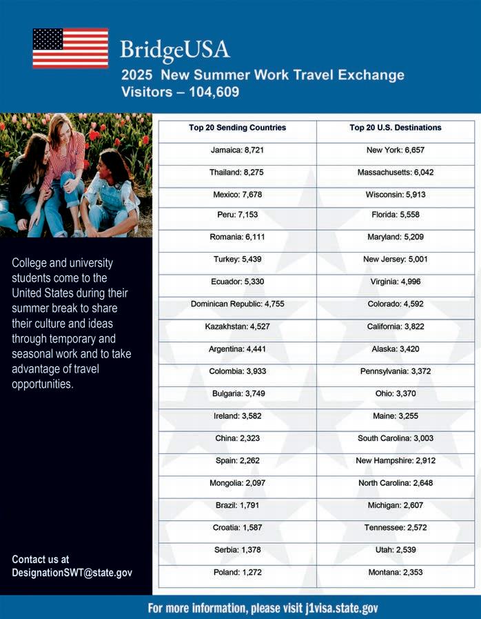 That is 13% of the 104,609 summer work travel exchange visitors (J-1’s) that came to this country last year via the state department’s BridgeUSA Summer Work Travel program, which compiles these and other foreign visitor statistics.