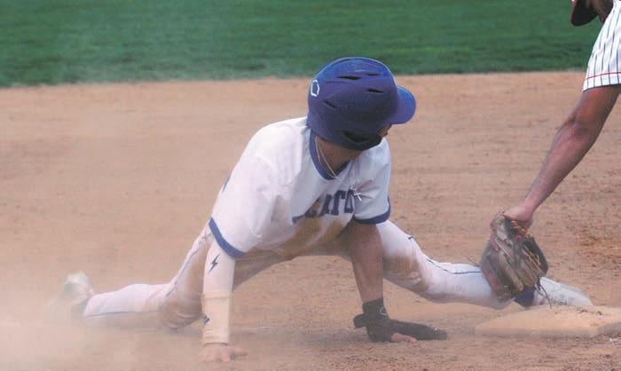 Owen Phillips is pictured stealing third base during the game against Delmar.