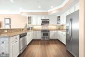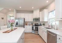 kitchen with high-end appliances, custom cabinetry, and a center island. The first floor offers