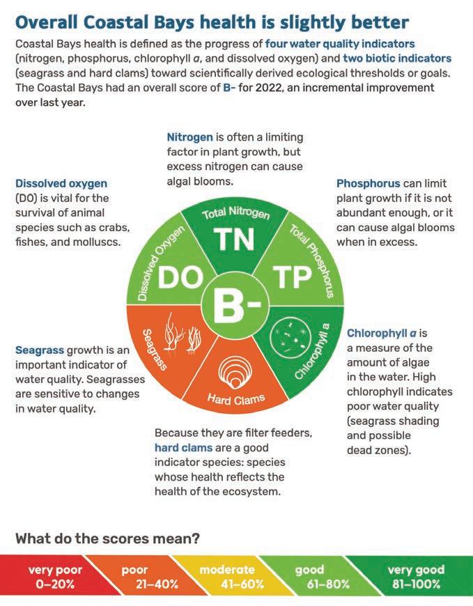 According to the official report card, which can be found on the Maryland Coastal Bays Program’s website, the bays’ health is determined by the “progress of four water quality indicators (nitrogen, phosphorus, chlorophyll a, and dissolved oxygen) and two biotic indicators (seagrass and hard clams) toward sci-