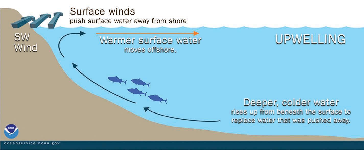 The source of these unusually low temperatures is called an “upwelling,” which is another way to say a layer of cold water moves up to the surface when the warmer water on top moves out.