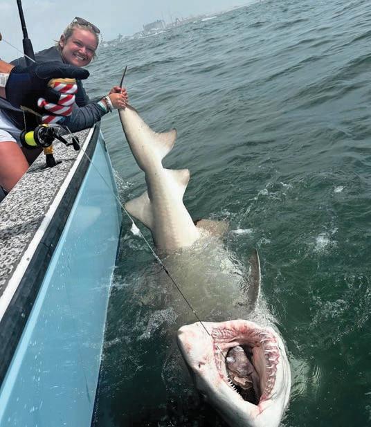 Above left, the first place wahoo in the Poor Girl’s Open was caught by the ladies fishing on board the WOP with Captain Nick Sampson. Above right, Captain Chase Eberle of Chasin’ Tides Charters has been having some fun catching and releasing some big sand tiger sharks with his anglers.