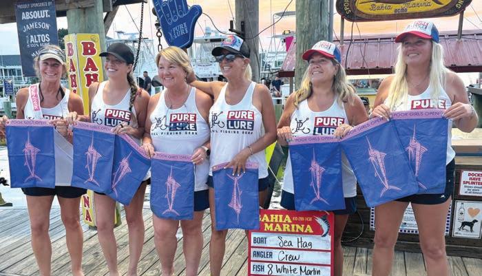 At the conclusion of this year’s Poor Girls Open, top, tournament organizers presented a $135,000 donation to American Cancer Society volunteers. Above, the team of Sea Hag display their eight white marlin release flags that won first place in the white marlin release division. Right, top junior angler bragging rights went to Ava Helwig for her two white marlin releases.