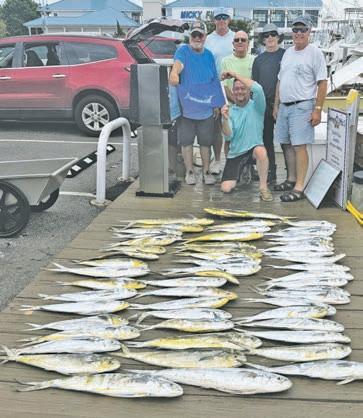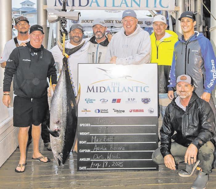 It was a busy opening day for the MidAtlantic Tournament, which features boats from Cape May, N.J. and Ocean City battling it out for more than $3.2 million in prize money. Monday saw 115 boats heading offshore to try and take advantage of a hot billfish bite over the weekend. On Tuesday, all boats stayed at the docks due to heavy surf and poor weather. On Wednesday, 73 boats went offshore even with Hurricane Erin swirling to the south. The tournament has been extended by one day to compensate for the hurricane affecting conditions. On Monday, a 71-pound white marlin caught by angler James Quillen aboard Jimmy Hahn’s Tailchaser from Pocomoke was brought to Sunset Marina in West Ocean City. The fish, pictured top left, could be worth $317,400 but there’s plenty of fishing to go. The tuna leader is Curtis Bay’s Nick Neary with a 103-pound big eye caught aboard his Lit Up by angler Jason Cullum, above right top. Second place currently belongs to Matt Weber of Vero Beach, Fla. aboard his Max Bet with a 97-pound yellowfin for angler Chris Wood, left. In the wahoo category, above, Bobby Pastorius of Ocean City aboard his Jenny Poo leads the category with a 60 pounder for angler Jennifer Pastorius. A full tourney recap will be published next week.