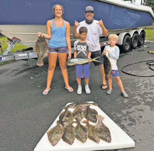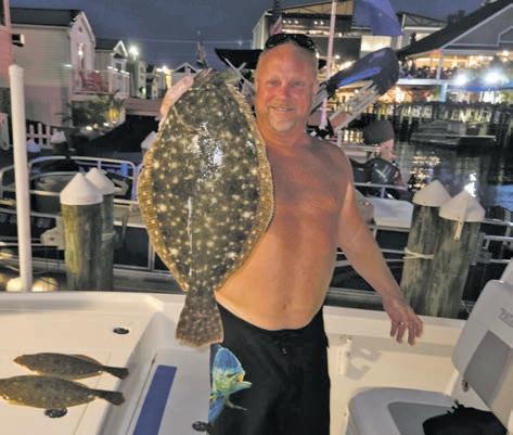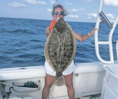 Below left, Courtney Johnston was fishing ocean structure when she landed this nice 7.4-pound flounder. Below middle, Kevin McNelis and his crew found 11 nice keeper flounder up to 23” on ocean structure. Below right, Rich Daiker caught this 6-pound flounder on a live bunker at the Route 50 Bridge.