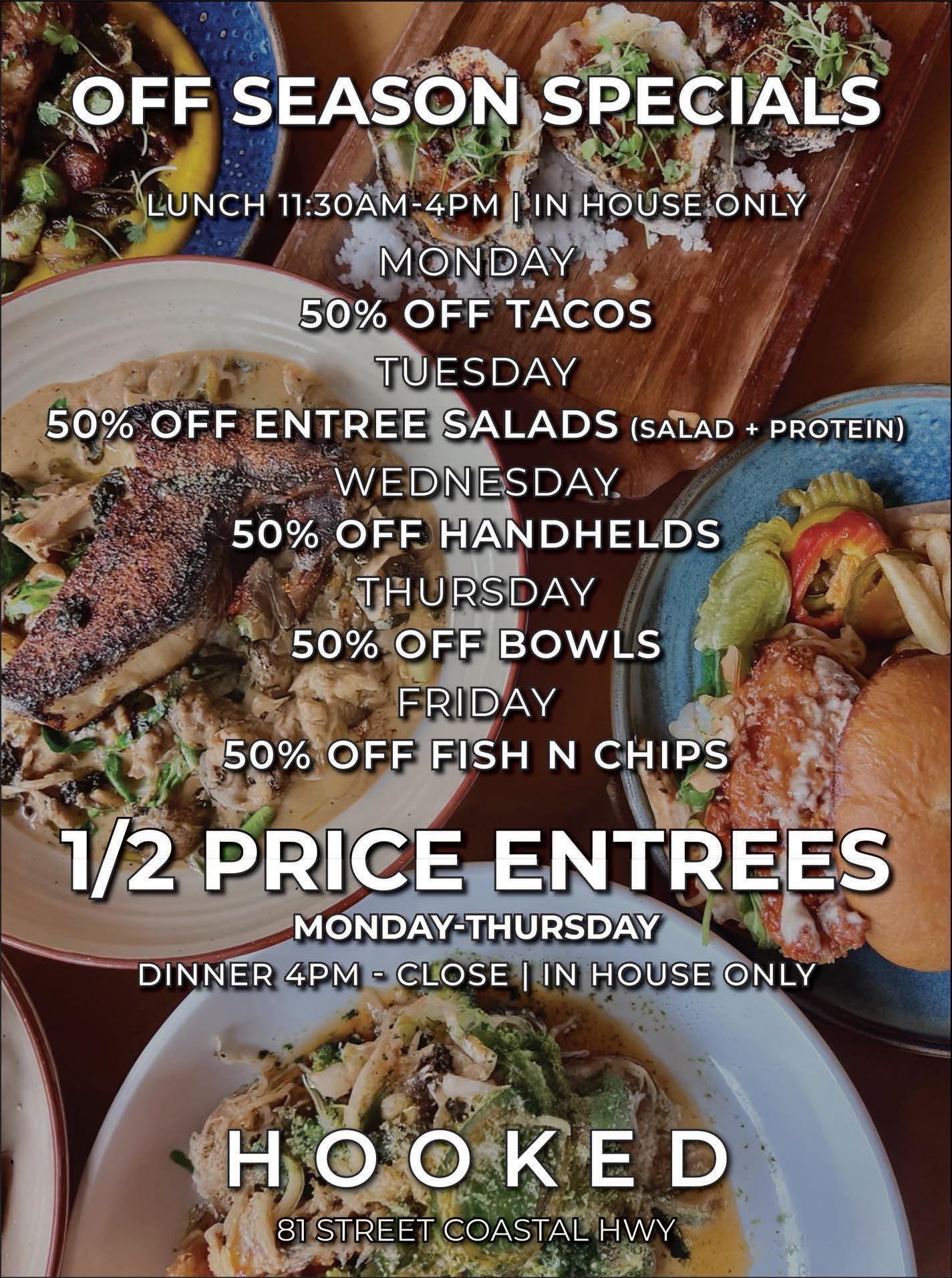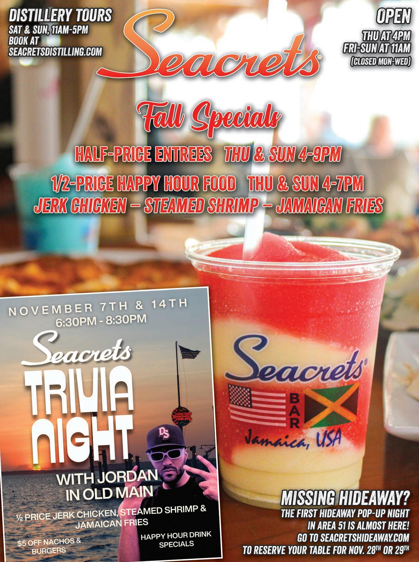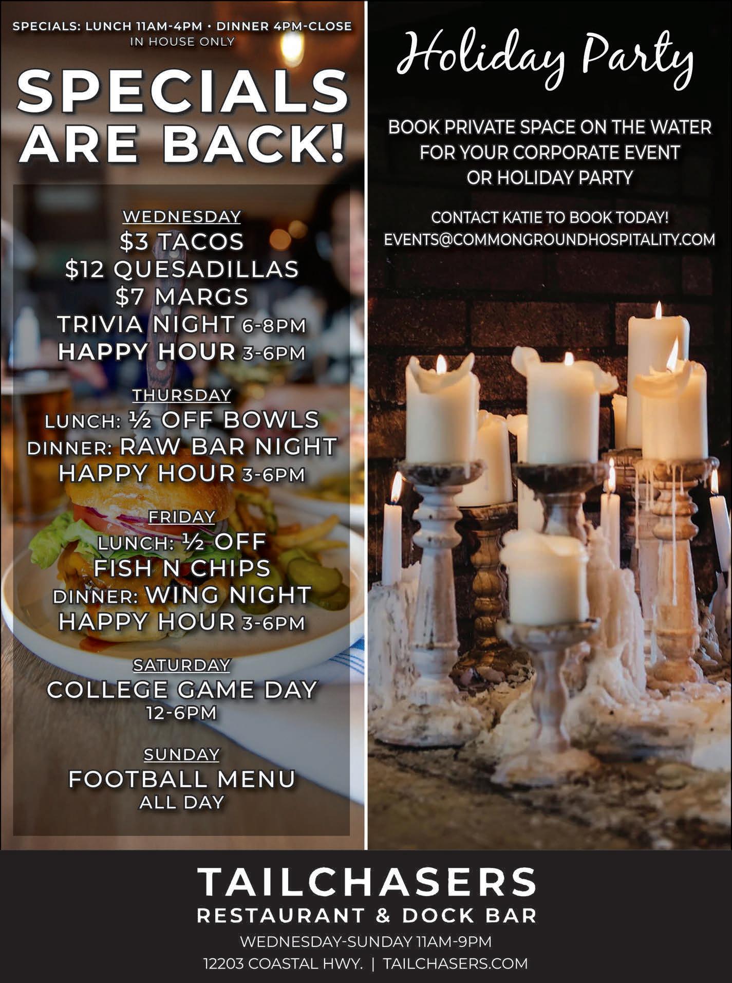 HLIVE ENTERTAINMENTH TONY MOWEN FRIDAY 11/7 • 5PM UNCLE WARD WEDNESDAY 11/12 • 5PM OFF SEASON SPECIALS ~ 3PM-CLOSE MINGO MONDAY, TRIVIA TUESDAY & BAR BINGO THURSDAY 6PM FRIDAY: BURLEY OAK BEER BATTERED ROCKFISH w/ Hand-Cut Fries $20 STEAMER BOWL Shrimp, Clams, Mussels, Crab Legs, Sausage & Corn $42