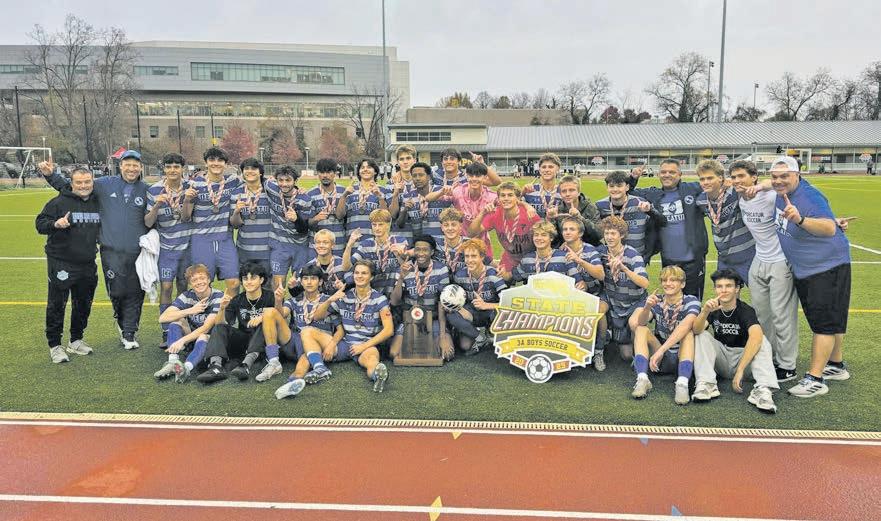 Coaches and players on Stephen Decatur’s varsity soccer team are pictured with their medals, trophies and sign after capturing the state championship. At right,