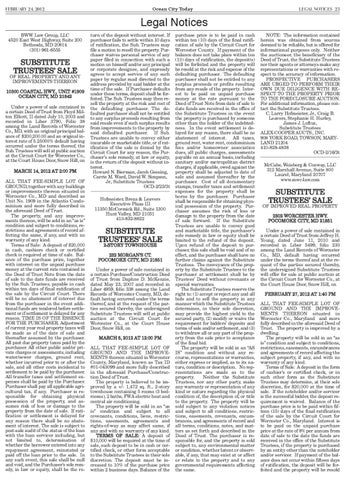 SUBSTITUTE TRUSTEES’ SALE 2-STORY TOWNHOUSE 232 MORGAN’S CT. POCOMOKE CITY, MD 21851 Under a power of sale contained in a certain Purchase/Construction Deed of Trust from Daphne D. McKenzie, dated May 23, 2007 and recorded in Liber 4959, folio 338 among the Land Records of Worcester County, MD, default having occurred under the terms thereof, and at the request of the parties secured thereby, the undersigned Substitute Trustees will sell at public auction at the Circuit Court for Worcester Co., at the Court House Door, Snow Hill, on MARCH 5, 2012 AT 12:00 PM ALL THAT FEE-SIMPLE LOT OF GROUND AND THE IMPROVEMENTS thereon situated in Worcester County, Maryland, known as Tax ID #01-043099 and more fully described in the aforesaid Purchase/Construction Deed of Trust. The property is believed to be improved by a +/- 1,472 sq. ft., 2-story townhouse containing 5 rooms (3 bedrooms), 2 baths, FWA electric heat and central air conditioning. The property will be sold in an “as is” condition and subject to all covenants, conditions, liens, restrictions, easements, agreements and rights-of-way as may affect same, if any and with no warranty of any kind. TERMS OF SALE: A deposit of $10,000 will be required at the time of sale, such deposit to be in cash or certified check, or other form acceptable to the Substitute Trustees in their sole discretion. The deposit must be increased to 10% of the purchase price within 2 business days. Balance of the