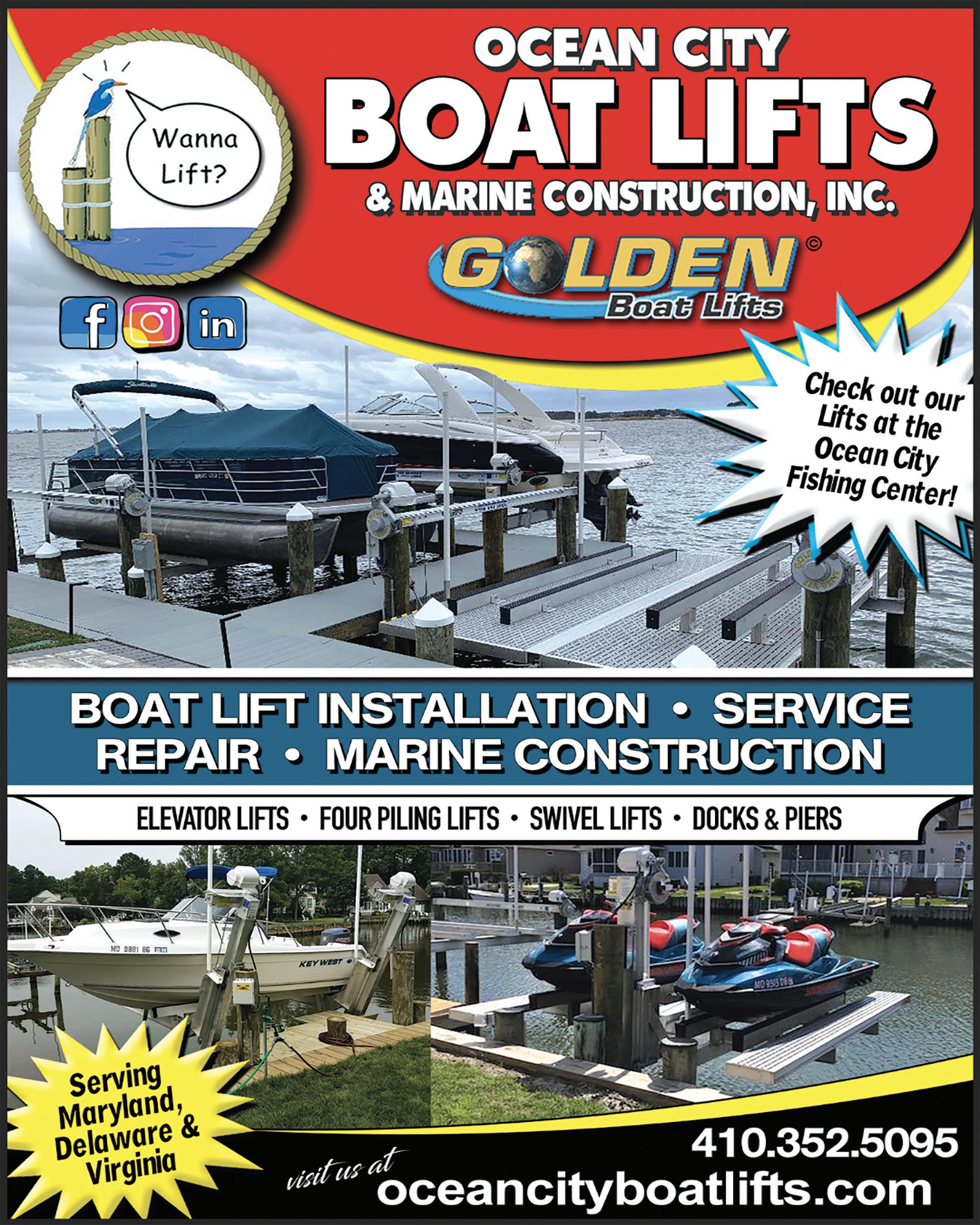 Past Commandant 571-332-8263 or visit http://www.FirstStateMarines.org/ First State Detachment 510 146th Street, Suite 3 Ocean City, MD 21842 The First State Detachment Marine Corps League Booth #904 ~ Licensed, Bonded & Insured Since 1985 ~ 410-641-6087 Office Fax 410-641-6734 Resort Service & Management Condo Maintenance & Management E-Mail RSMOC@aol.com John & Judy Hasenei Owners 410-430-3622 John’s Cell 42 Castle Drive Ocean Pines, MD 21811 Judy’s Cell 202-215-1632 Notary Public QUALITY MEANS DOING IT JUST-RITE MARINE CONSTRUCTION JUST-RITE MARINE INC. 410-641-9961 • JUSTRITEMARINEINC.COM MIKE@JUSTRITEMARINE.COM MD MARINE 083(E) • MHIC 71561 • OC 30542 • DE 2019101403 Inside Storage for Small Boats & Pontoons