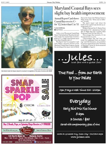 Fins in the Ocean City Fishing Center in West Ocean City. “Every year is different,” he said. The year’s report card about the health of the coastal bays showed an average grade of C+. Newport Bay and the St. Martin River had grades of D+. Assawoman Bay and Isle of Wight Bay had C grades while Sinepuxent fared the best with a B-. Chincoteague Bay received a C+ for the second year in a row. “Chincoteague Bay had been our jewel, but seagrasses there are declining,” said Bill Dennison, vice president for science applications at the University of Maryland Center for Environmental See EXCESS on Page 6A