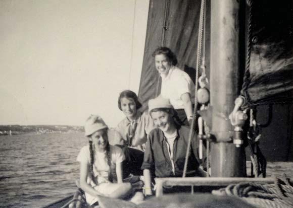 Anthea (standing by the mast) while sailing with her cousins in the mid 1950s