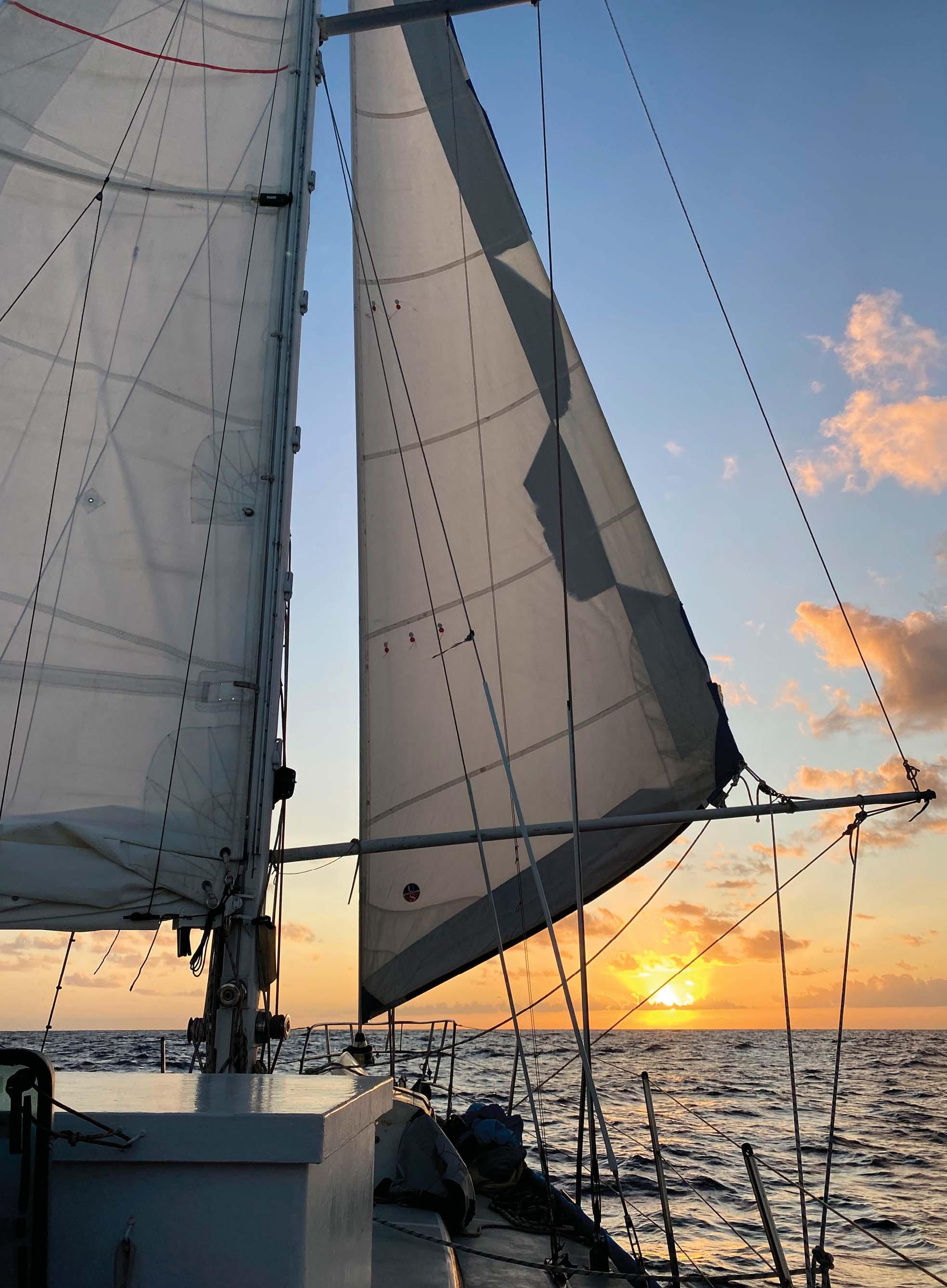 Max and Tanya in Alalilia left Ascension for Brazil at the same time as I left for Grenada. Four days into the passage they messaged me on my Garmin inReach from their satellite phone – they had hit a whale and lost their rudder. They were about 150 miles upwind of me, so I altered course to intercept. I asked them to send a position report with each message so I could judge their drift. It took about 36 hours to reach them and of course it was near midnight by the time I saw their masthead light swaying in the Atlantic swell. We had formulated a plan for me to give them my series drogue so they could steer their boat by drag. The tricky part was passing the drogue to a swaying boat without steering at night. The drogue was stored in a dry bag, to which I tied a line to throw to Max. I figured that as soon as I saw that he’d grabbed the line I could toss the bag into the water and he could haul it in. It went off without a hitch on the second attempt. Max and Tanya got it to work and continued to Brazil while I changed course back to Grenada.