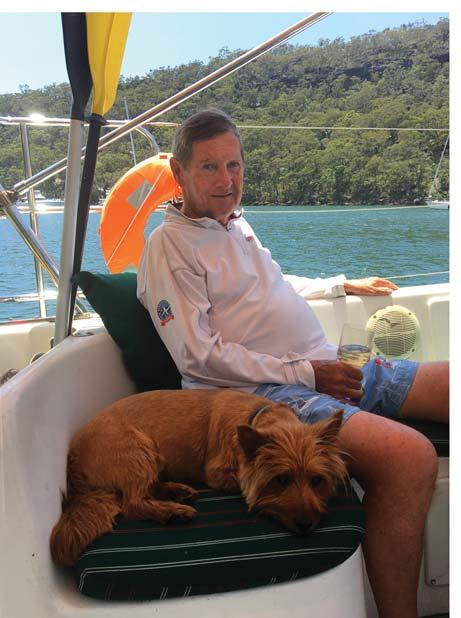 Michael relaxing aboard Irish, his beloved Young 41 with, below, his faithful companion, Australian terrier, Rory
