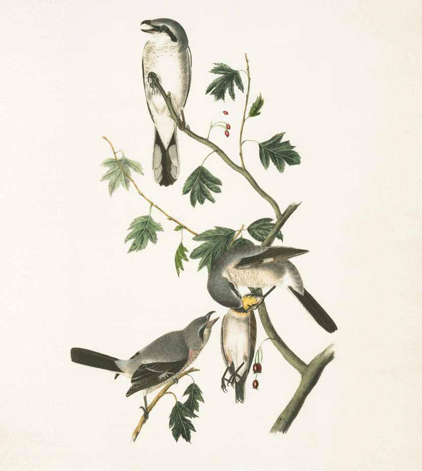 General Research Division, The New York Public Library. "Great American Shrike, 1. Male 2. Female 3. Young (Cratagus. Apiifolia.)" The New York Public Library Digital Collections