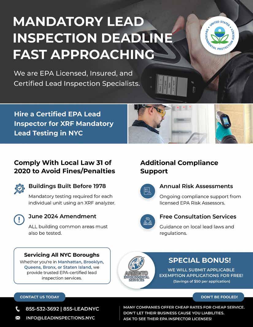 August 9 Local Law 31 Deadline: Owners must use an Environmental Protection Agency (EPA) certified inspector or risk assessor to conduct XRF testing for the presence of lead-based paint in a dweliing unit. The inspection must take place before this date.