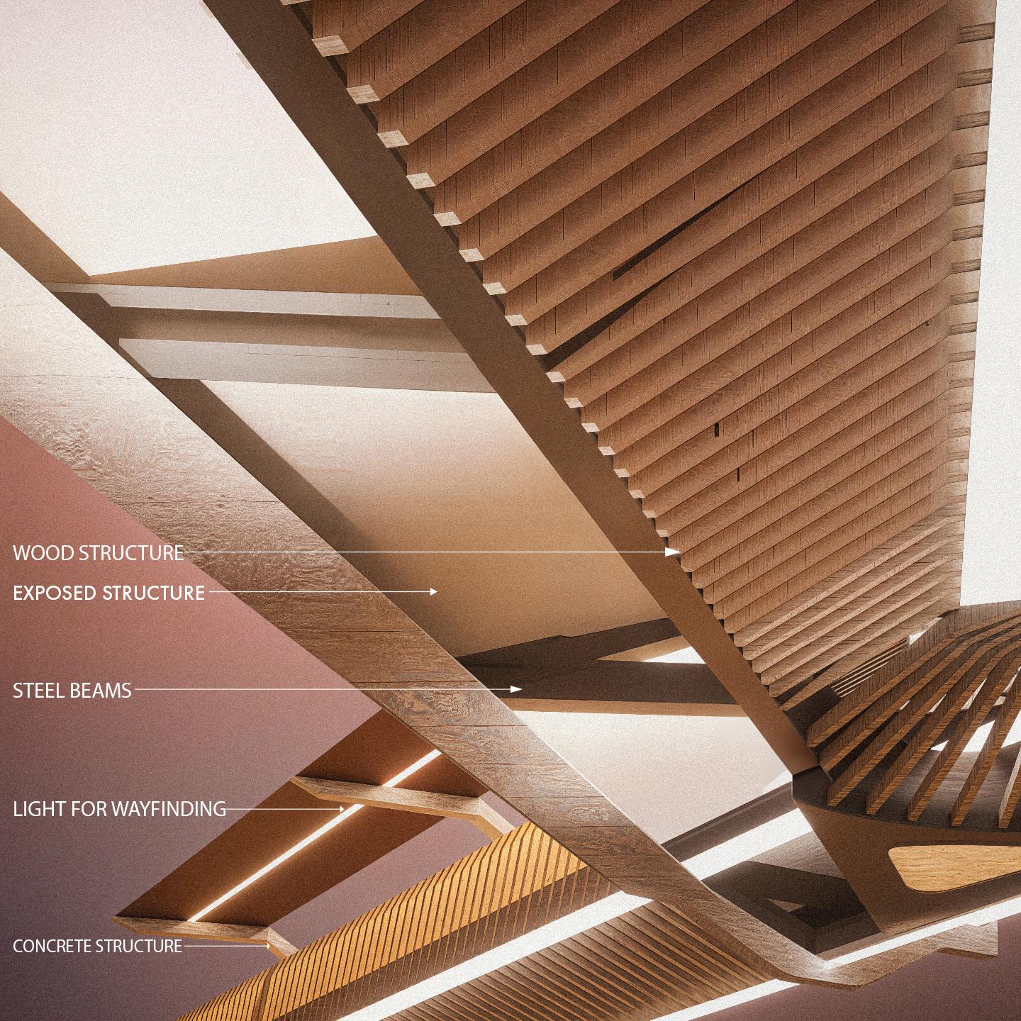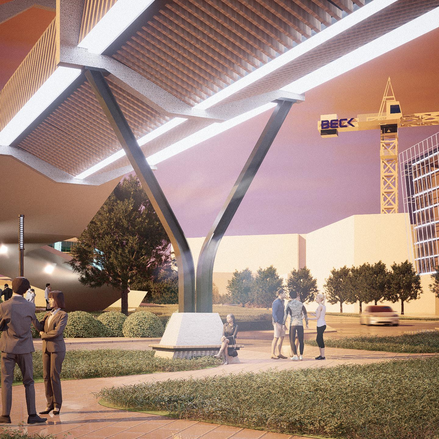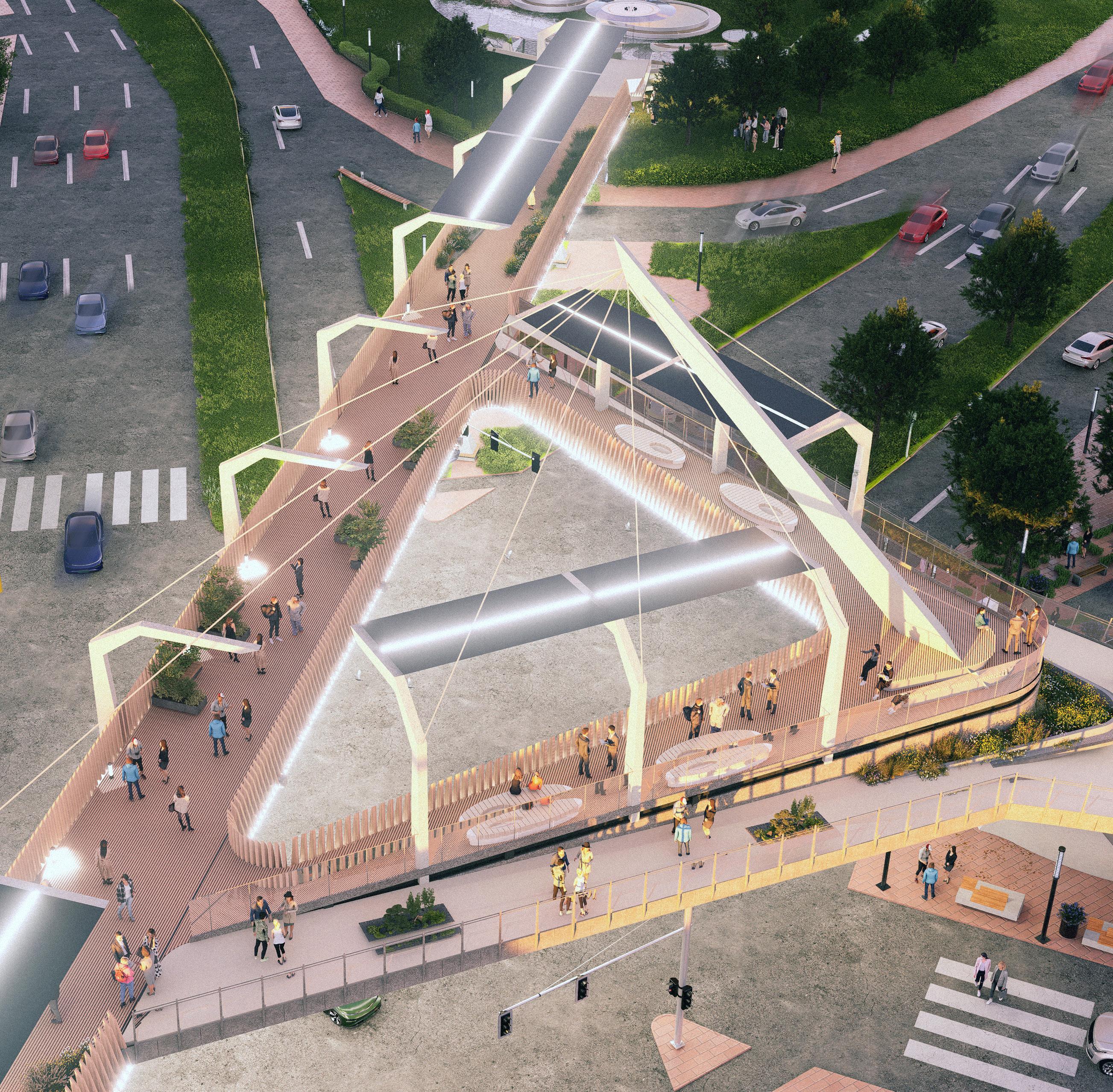 THE PROJECT TRANSFORMS THIS DISCONNECTED URBAN NODE INTO AN ELEVATED, PEOPLE FOCUSED NETWORK THAT RECONNECTS THE CITY BOTH PHYSICALLY AND SOCIALLY. THROUGH A CLEAR GEOMETRIC LOGIC OF TRIANGULATION AND CONVERGENCE, THE BRIDGE INTRODUCES ORDER WITHIN CHAOS, CREATING A CIVIC LANDMARK THAT PRIORITIZES PEDESTRIAN MOVEMENT, ACCESSIBILITY, AND CULTURAL ENGAGEMENT .