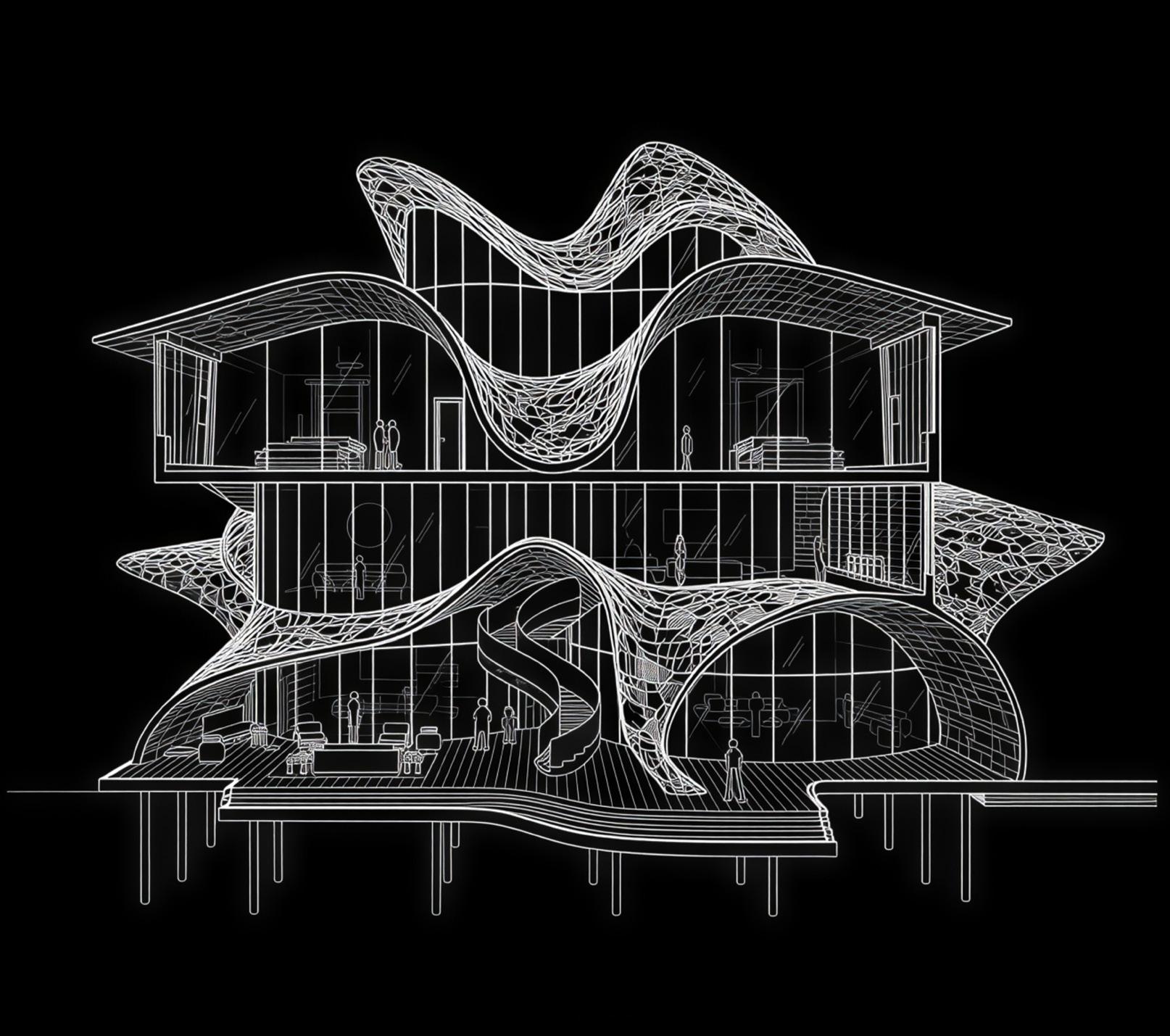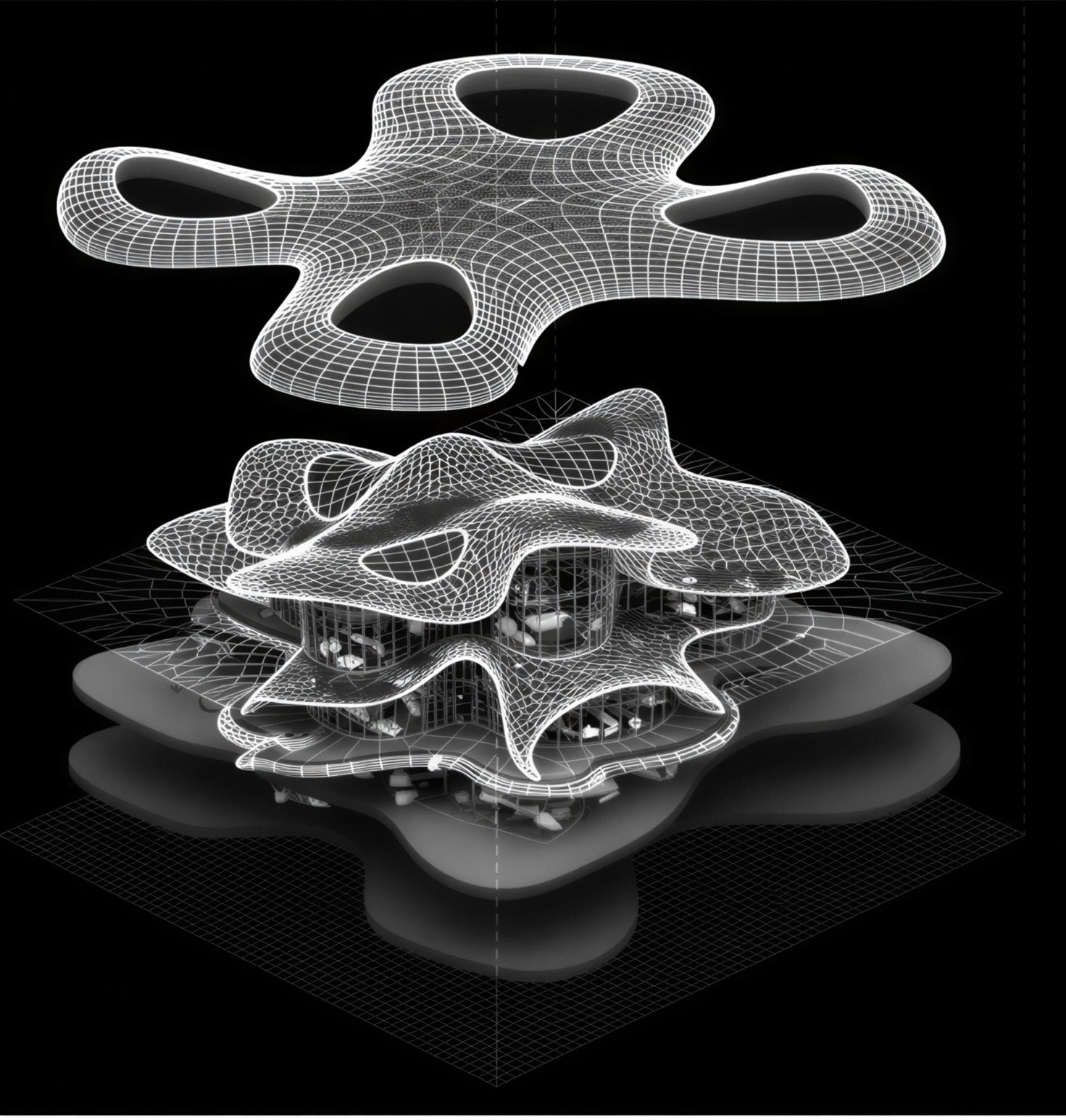 - NATURAL FORM : THE FLOWING, MULTI-LAYERED ROOF MIMICS THE UNDULATING PATTERNS OF FUNGAL MYCELIUM AND CORAL REEFS, WHICH GROW ADAPTIVELY ACCORDING TO ENVIRONMENTAL PRESSURES.