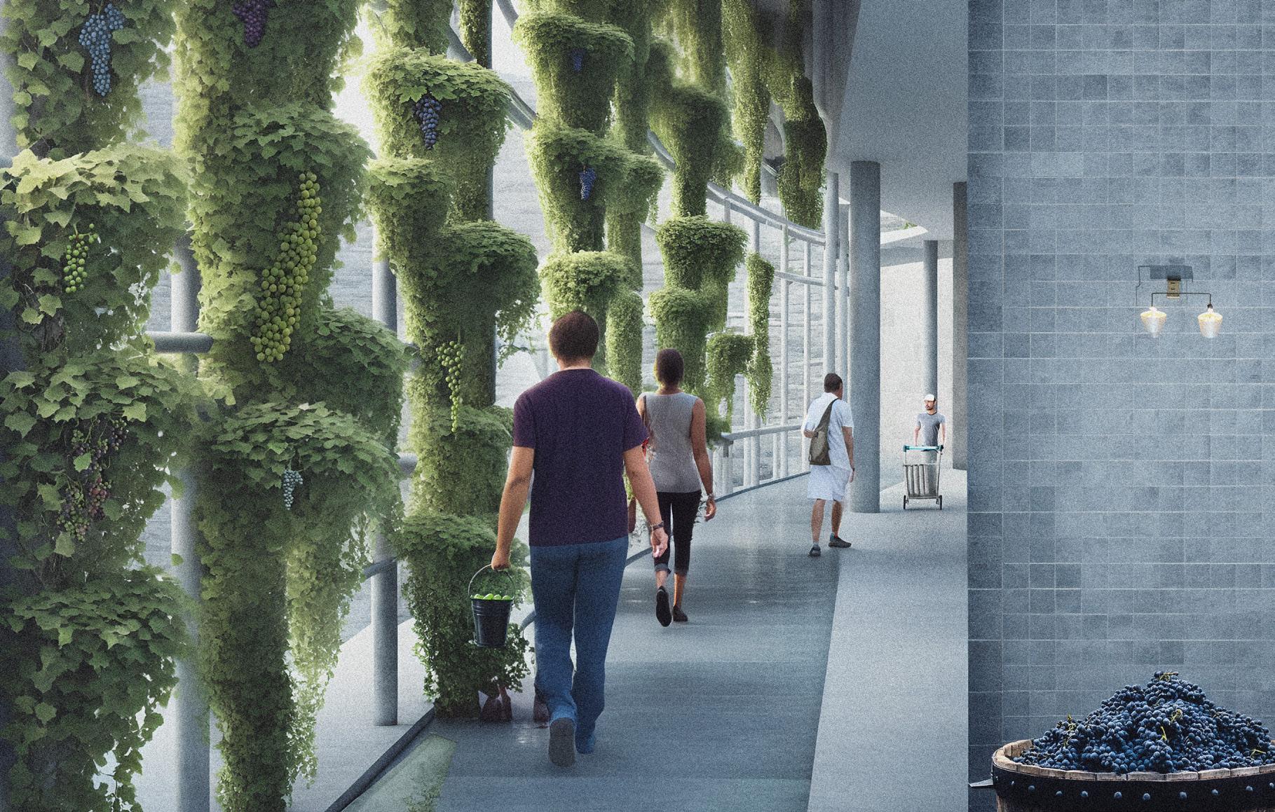THIS RENDER SHOWCASES THE FOURTH FLOOR, WHICH OPENS UP 25 FEET TO THE ROOF, CREATING A SPACIOUS, LIGHT-FILLED ENVIRONMENT. ON ONE SIDE, THE VINECOVERED STRUCTURE INVITES VISITORS TO WALK THROUGH, PLUCK GRAPES, AND IMMERSE THEMSELVES IN THE SPACE.