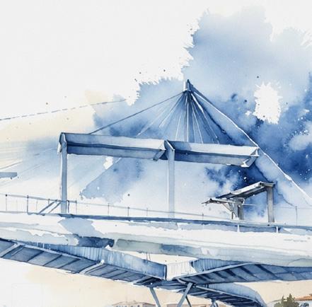 STRUCTURE AND MATERIALITY : A LIGHTWEIGHT STEEL FRAMEWORK SUPPORTS COMPOSITE DECK PANELS AND TENSILE CABLE SYSTEMS. THE STRUCTURE’S MINIMAL PROFILE MAINTAINS OPENNESS AND TRANSPARENCY, ENSURING VISIBILITY ACROSS THE INTERSECTION.