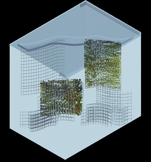 THE STRUCTURAL GRID SUPPORTS VERTICAL COLUMNS THAT ANCHOR THE BUILDING AND GUIDE THE GROWTH OF VINES.