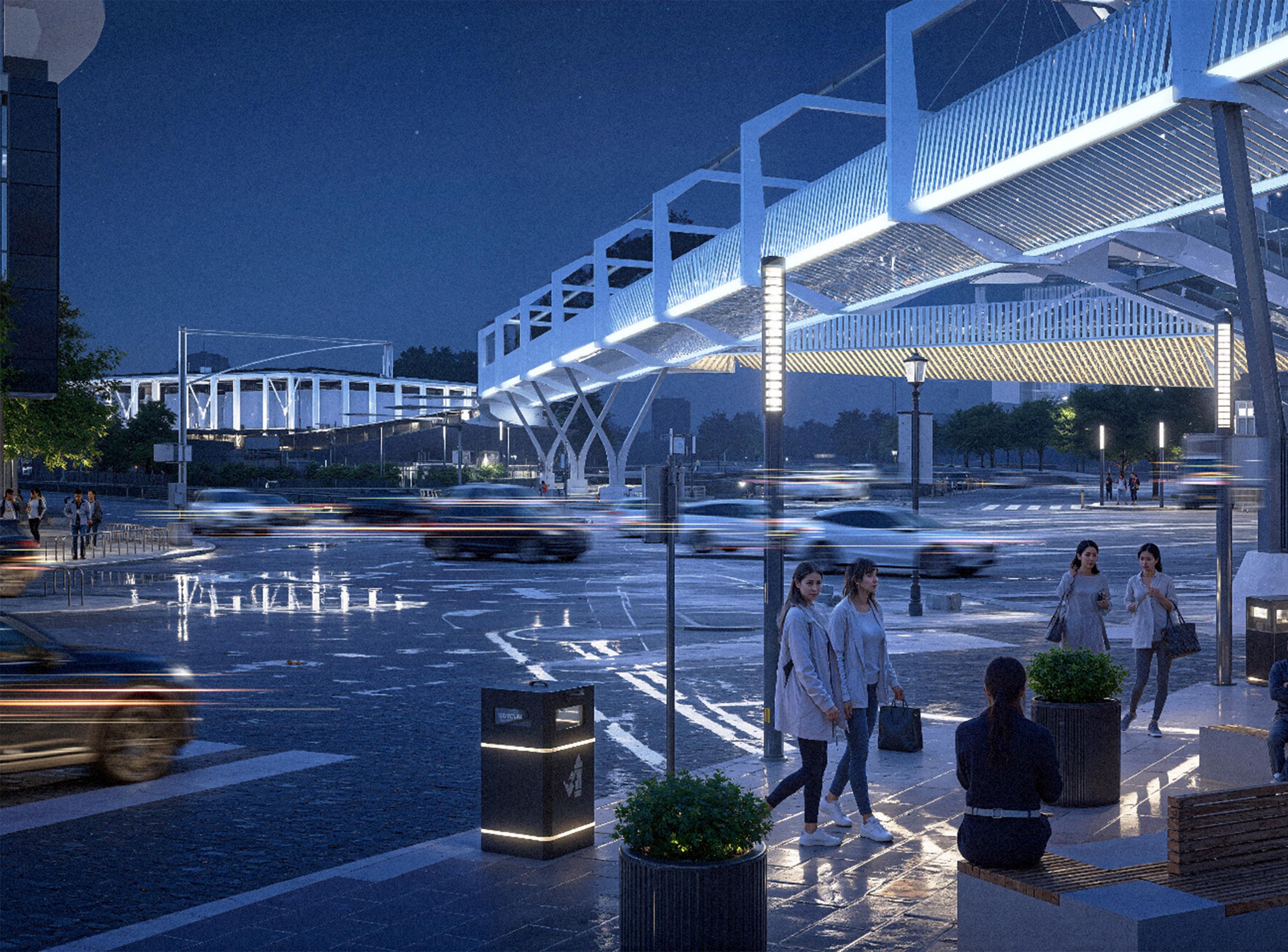 INTEGRATED LED STRIPS LINE THE PATHWAY AND CANOPY BEAMS, PROVIDING UNIFORM ILLUMINATION AND ACCENTUATING THE BRIDGE’S GEOMETRIC CLARITY AT NIGHT. THE LIGHTING STRATEGY ENSURES BOTH SAFETY AND URBAN VISIBILITY.